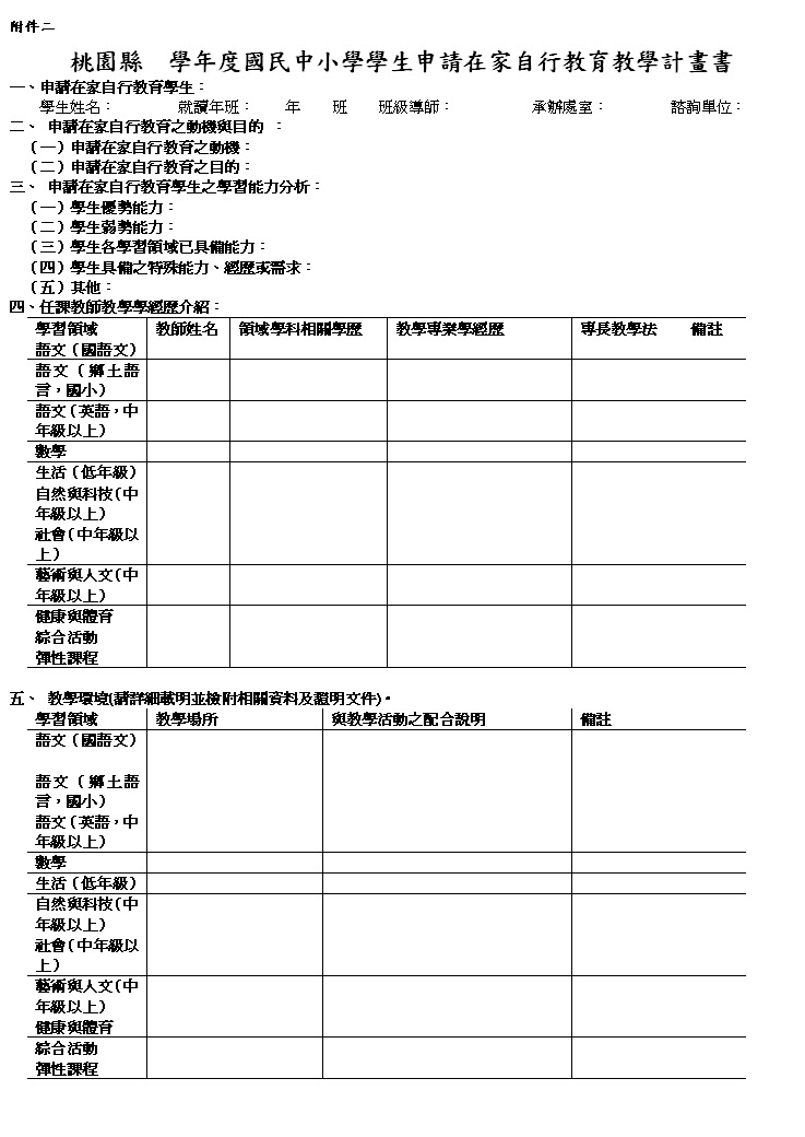 2.繳交依據九年一貫課程綱要(國小六年級及國中三年級應依據八二年課程標準)擬定之在家自行教育教學計畫(附件二)。