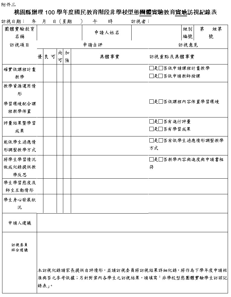 桃園縣100學年度國民教育階段非學校型態個人及團體實驗教育